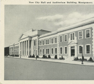 …built ca 1937 by Montgomery contractor Algenon Blair, a friend of my Grandfather Banks. Montgomery’s city hall burned in 1932, and this was the replacement. For 30-odd years this auditorium was the scene of Montgomery’s big events, balls, and productions. It was cooled by sliding huge blocks of ice into the basement and blowing air across the ice pile. Perhaps its crowning moment was the funeral of Hank Williams in 1953. Now being converted to admin space and thus absorbed by the city hall offices on each side; how sad! The hall was recently renovated to a large public meeting space.
