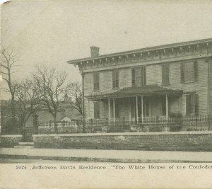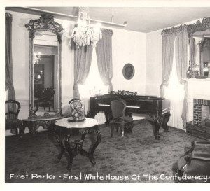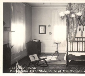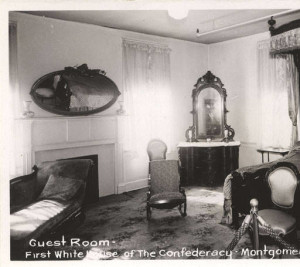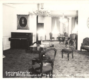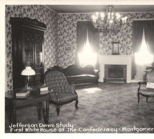 …built in 1835 for William Sayre, one of the founders of First Presbyterian Church, Montgomery’s first organized church. It is perhaps “Federal Style Colonial”, with Italianate detail added circa 1850. The house originally stood at the corner of Bibb and Lee Streets, and was moved to its present location in front of the State Archives Building in 1900 (the Archives wasn’t built until 1939). Sayer moved on to Mobile where he became mayor, and the home was subsquently occupied by several outstanding citizens, until in 1861, it was selected to be the residence of the President of the newly formed Confederate States of America. The house served in that capacity for three months, until the capitol was moved to a more civilized location. The house was added to the National Registry of Historic Places in 1974.