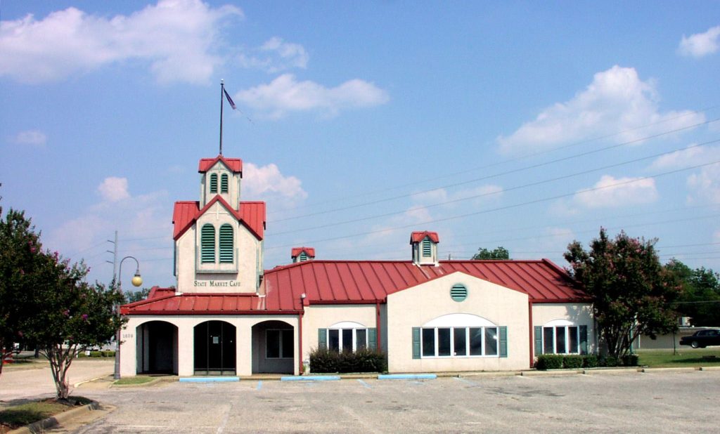 Part of the Montgomery State Farmers Market on Federal Drive at Coliseum Boulevard. It has provided breakfast and lunch for produce vendors and their customers for a quarter century. This building was the one most visible from the intersection, and it stood as the image of the complex. Notice in the photo to the right how they have since tried removing the word “Cafe”.