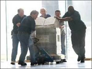 The lobby was the scene of the national furor over Chief Justice Roy Moore and his famous 10-Commandments Monument. The pics below show Roy Moore admiring his creation before he was removed from office, and (on the right) the building staff hauling it away in response to a court order. The center figure of the five is the Building Administrator, and a Rotary tablemate of mine for many years. I’m surprised that the massive stone didn’t over-stress the floor beams.